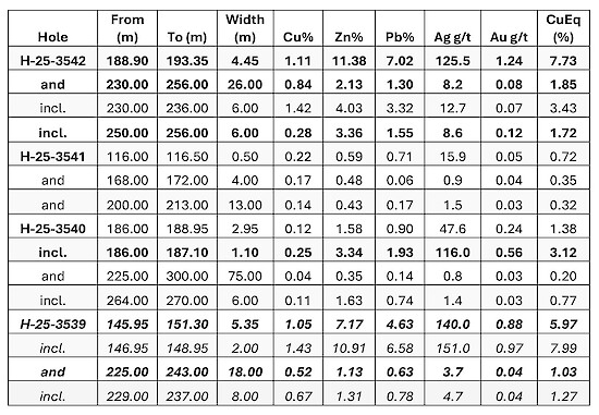 Table 1. Assay Highlights. CuEq% as per estimated recovered metal prices of September 16, 2025 (see notes 1 & 2 at end of release for additional explanation). H-25-3539 results previously released. H-25-3542 is a 50 m step-out west of H-25-3539. H-25-3541 is a 50 m step-out east of H-25-3539. H-25-3540 is a 50 m step-out north (down dip of H-25-3539).