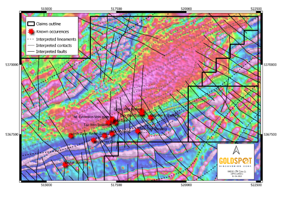 Figure 3 - Selected target areas for exploration by GoldSpot in the vicinity of the known vein systems, over 1VD magnetics