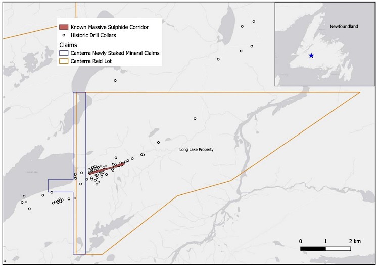 Vancouver, B.C. (June 13, 2023) – Canterra Minerals Corporation (TSXV:CTM) (OTCQB: CTMCF) (“Canterra” or the “Company”) has expanded the land position of its 100% owned Long Lake critical minerals massive-sulphide project (the “Long Lake Project”), located in central Newfoundland through staking. The staking involved the addition of 15 claims over 374 hectares.
