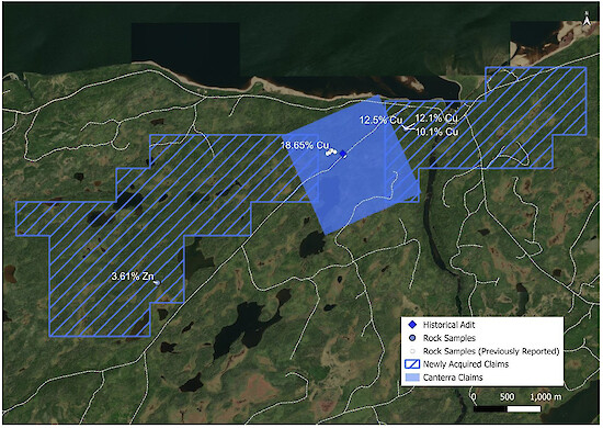 Vancouver, B.C. (August 7, 2024) – Canterra Minerals Corporation (TSXV: CTM) (OTCQB: CTMCF) (“Canterra” or the “Company”) is pleased to announce exploration results returning up to 12.5% copper in grab samples from the Victoria Project, and that it has entered into an Option Agreement (the “Agreement”) with local prospectors (collectively, the “Optionors”), to acquire a 100% interest in adjacent properties to expand the Company’s Victoria Project in the Central Newfoundland Mining District. The Victoria Project is a critical minerals prospect with small scale historic mining and known high-grade copper occurrences.