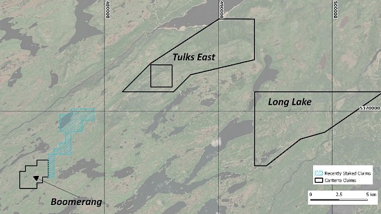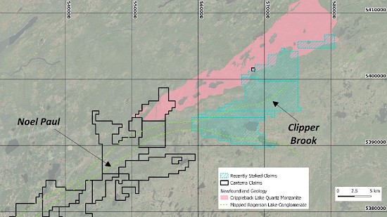 Vancouver, B.C. (June 23, 2022) – Canterra Minerals Corporation (TSXV:CTM, OTCQB: CTMCF) ("Canterra" or the "Company") is pleased to announce that it has increased its land holdings in central Newfoundland. This increase in land position includes significant claims along the Rogerson Lake Structural Corridor at the new Clipper Brook Property where the Company is targeting gold mineralization similar to that found at Wilding, and additional claims adjacent to the Boomerang Project, a volcanogenic massive sulphide project.