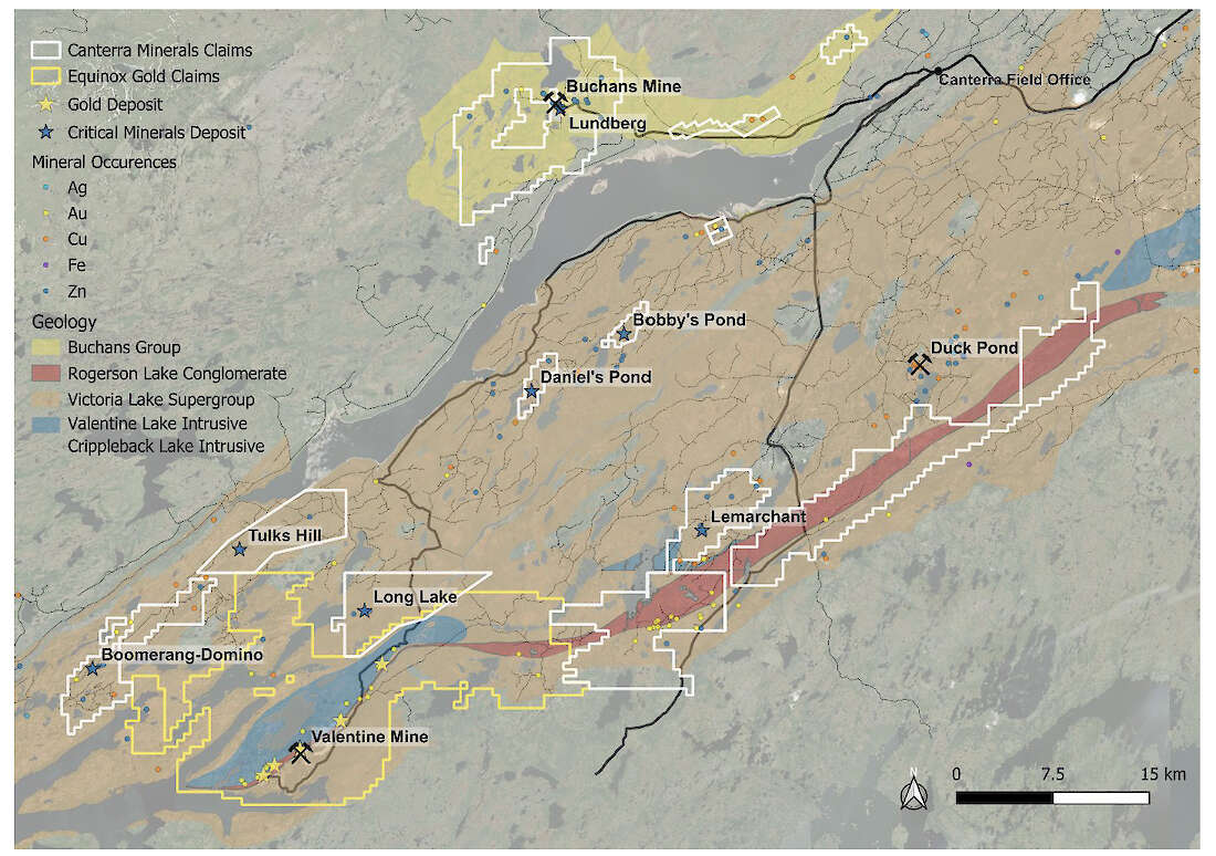 Canterra is a diversified minerals exploration company focused on critical minerals and gold in central Newfoundland. The Company’s projects include seven mineral deposits located in close proximity to the world-renowned, past-producing Buchans Mine and Teck Resources’ Duck Pond Mine, which collectively produced copper, zinc, lead, silver and gold. Several of Canterra’s deposits support current and historical Mineral Resource Estimates prepared in accordance with National Instrument 43-101 and the Canadian Institute of Mining, Metallurgy, and Petroleum Definition Standards for Mineral Resources and Mineral Reserves. Canterra’s gold projects are located on trend of Equinox Gold’s Valentine mine currently in production and cover a ~55 km extension of the same structural corridor that hosts mineralization within Equinox Gold’s mine project. Past drilling by Canterra and others within the Company’s gold projects intersected multiple occurrences of orogenic-style gold mineralization within a large land position that remains underexplored.