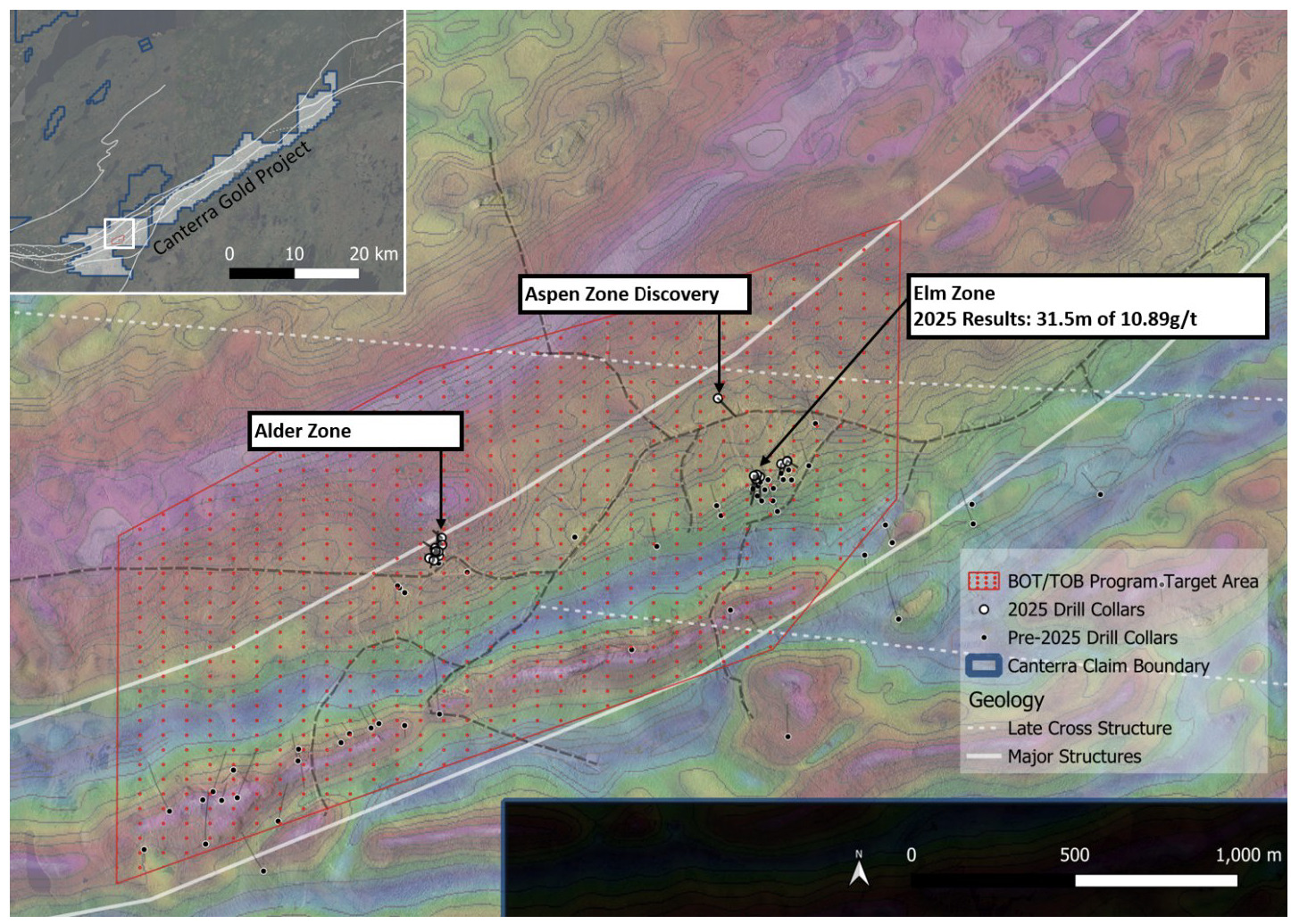 The 2026 campaign marks a transition from target generation to systematic drill testing across three areas: (i) drill-test high-priority targets at Buchans identified by modern deep-seeking geophysics and integrated geological modelling, (ii) prioritize selective follow-up drilling across Canterra’s broader Victoria Lake Supergroup (“VLSG”) portfolio, as potential satellite deposits to the Buchans Project; and (iii) advance gold targets at the Wilding Gold Project along the same structural corridor that hosts Equinox Gold’s producing Valentine Mine.