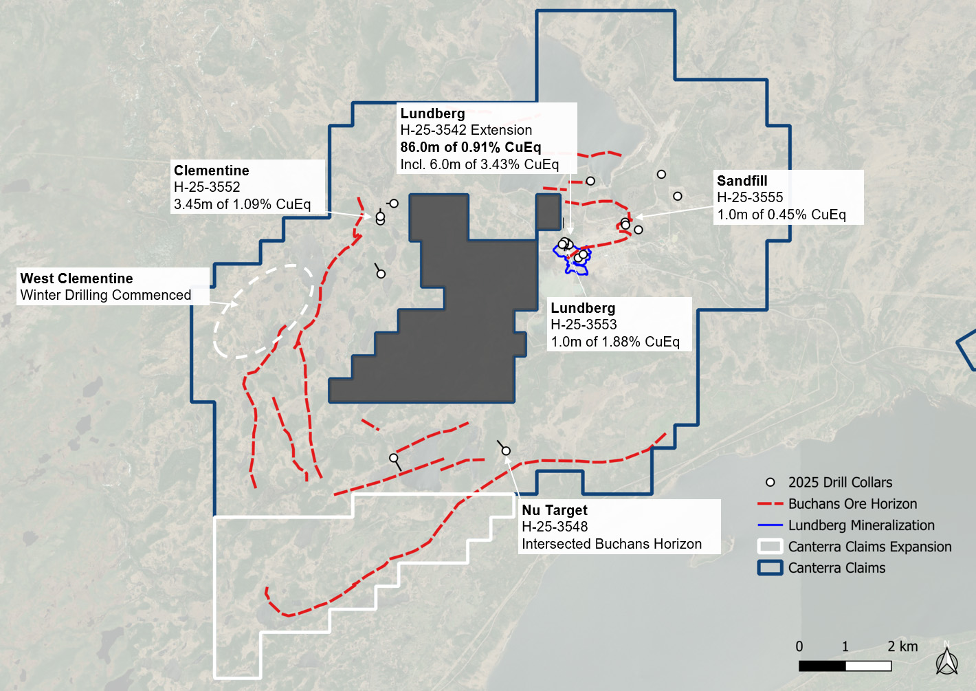 Vancouver, B.C. (February 25, 2026) – Canterra Minerals Corporation (TSXV:CTM) (OTCQB: CTMCF) (FSE:DXZB) (“Canterra” or the “Company”) is pleased to announce drill results from the 2025 program at its Buchans Project in the Central Newfoundland Mining District, extending mineralization at the Lundberg Deposit and validating new, deep-seeking 3DIP targets across the district.