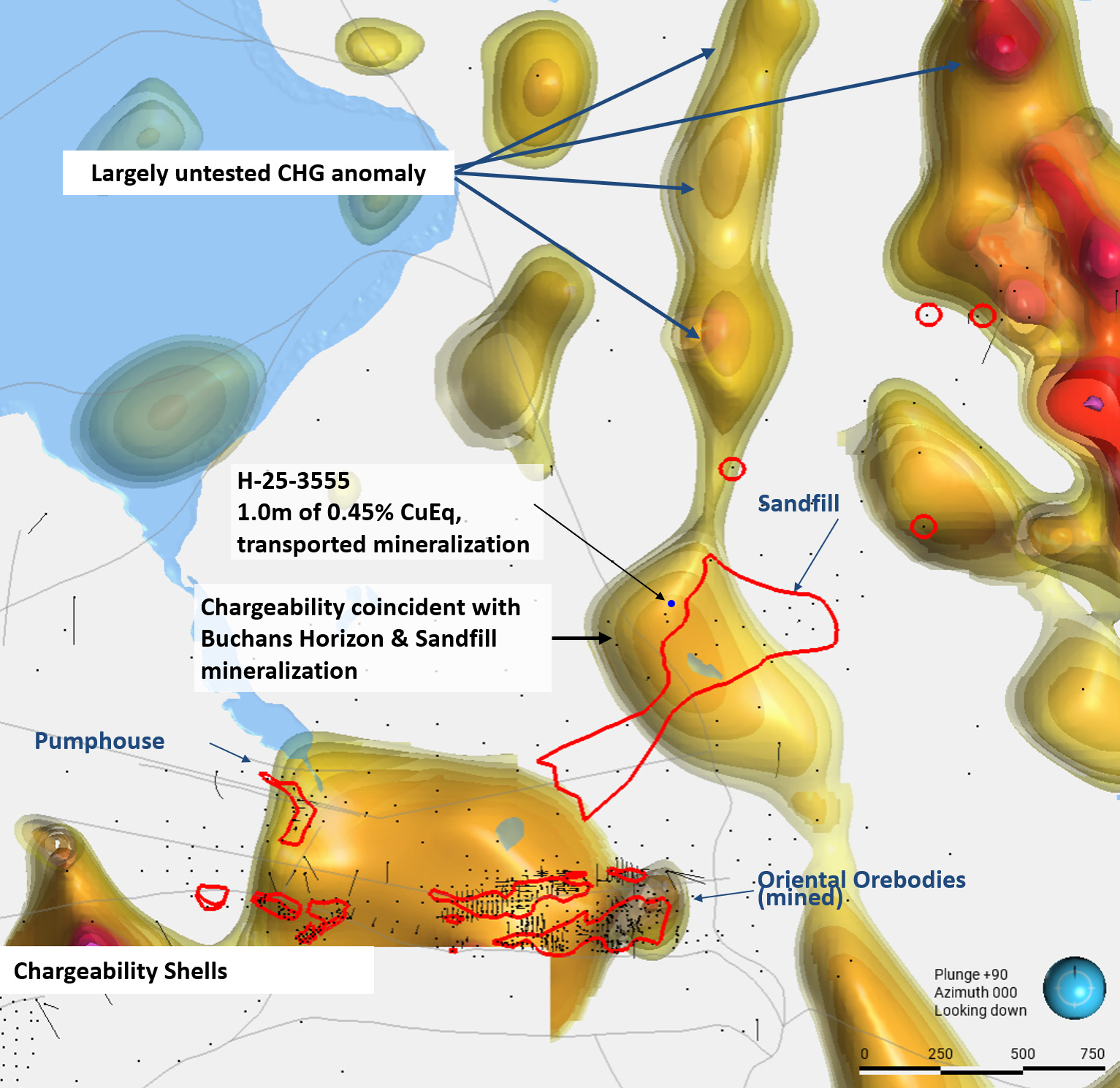 - Sandfill: Hole H-25-3555 intersected 1.0 m grading 0.45% CuEq, mineralization coincident with a large, 1.5 km-long chargeability anomaly and associated alteration footprint, including a broad zone of Na₂O depletion that appears to broaden to ~200 m thickness in adjacent historical drill holes, a key VMS pathfinder. The majority of this 1.5 km anomaly remains untested and is a high-priority target for 2026 drilling.