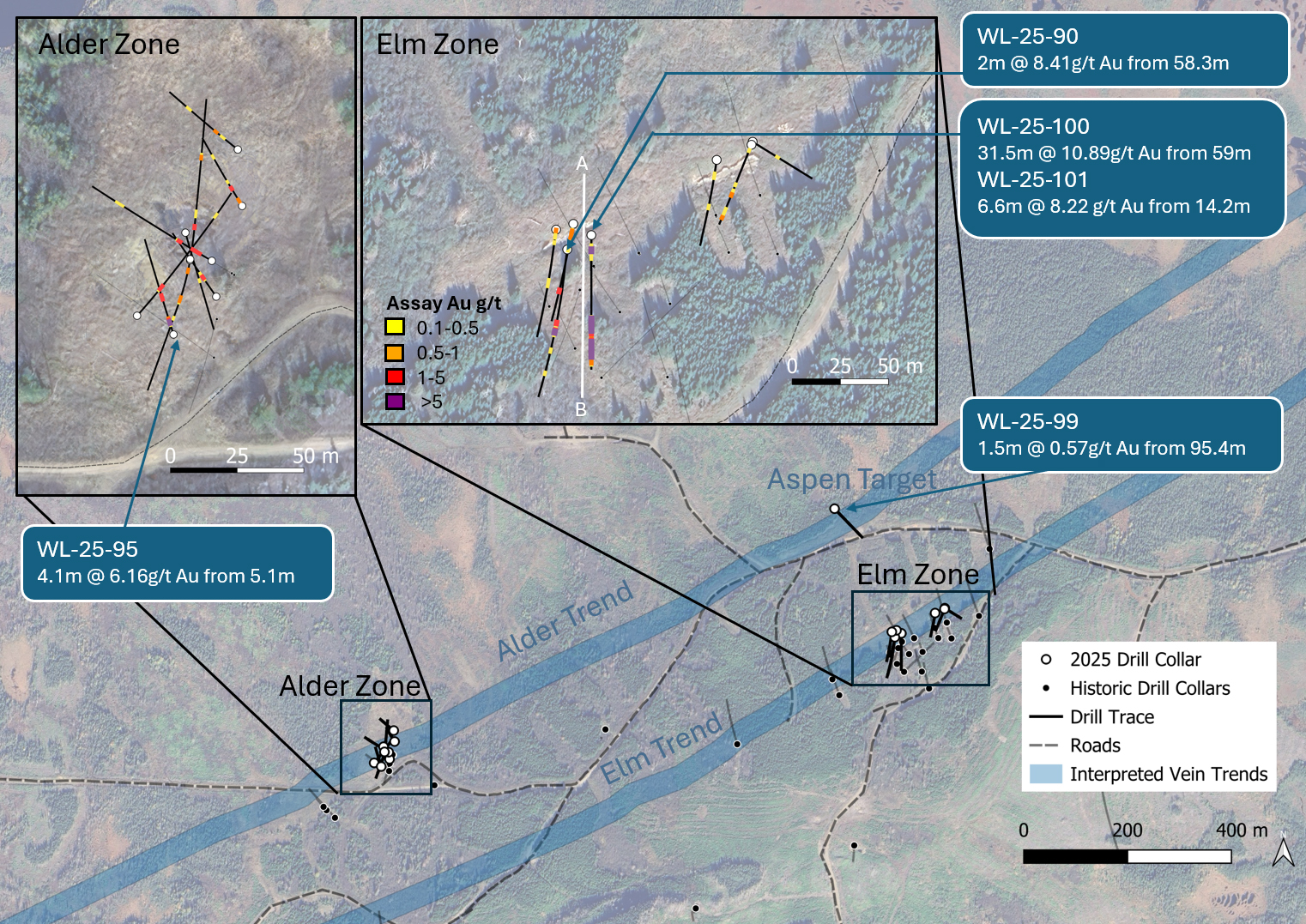 Hole WL-25-99 tested a new geophysical IP target area interpreted to be the potential northeast extension of the Alder Zone named the Aspen Target. This hole intersected vein material and associated hydrothermal alteration consistent with that observed at the established Elm and Alder Zones, further supporting the interpretation that alteration halos may extend beyond currently defined gold intercepts. Initial results reported anomalous gold grades up to 0.57 g/t Au and represent a successful first test of Aspen.