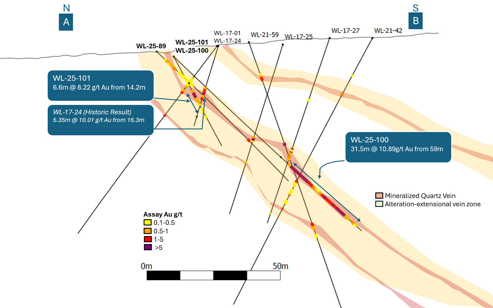 Results from WL-25-100 and WL-25-101 provide additional support for continuity of the Elm Zone vein system, as gold grades are consistently elevated where quartz-sulphide vein material and associated alteration are present. Together, these holes demonstrate repeatability of mineralization style and grade association within the Elm corridor and will be used to refine targeting for follow-up drilling.