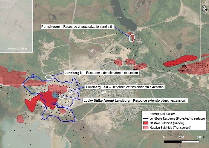 Figure 1. Buchans drilling targets and limits of Lundberg Resource estimate projected vertically to surface. 2025 drill targets in white circles.